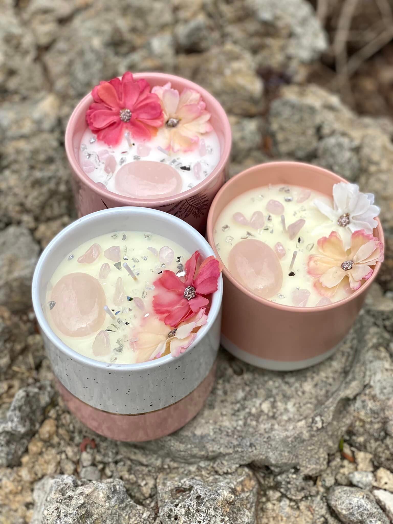 Scented candles in reusable ceramic jars with bamboo lid. Made with natural crystals and artificial flowers.