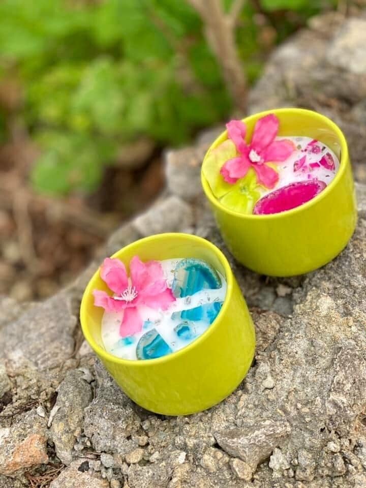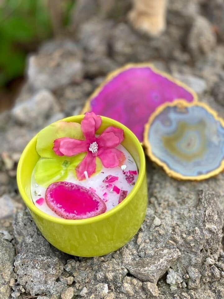 Scented candles in reusable ceramic jars. Made with natural crystals & artificial flowers